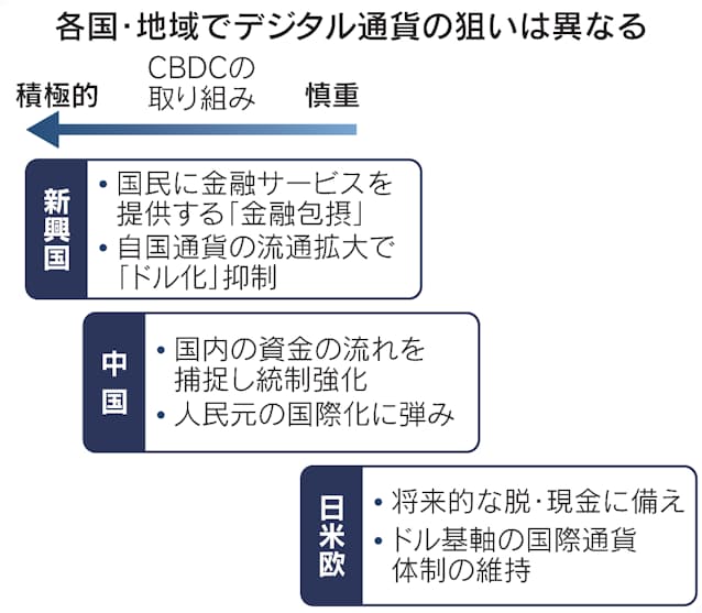 ドルを頂点にユーロや円など世界で流通する通貨を抱える日米欧はCBDCに慎重な姿勢を続けてきた。資金洗浄(マネーロンダリング)に使われるリスク、既存の銀行システムとの共存といった課題も多く、新興国ほどの利点を見いだせなかったためだ。