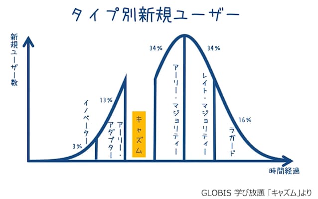 過去に作られたのバーチャルプラットフォーム、ぱどタウンやセカンド・ライフは「初期市場」には受け入れられたものの、キャズムを越えて普及することはありませんでした。このグラフでみると、メタバースはキャズムを超えたばかりのポイントにあるわけです。